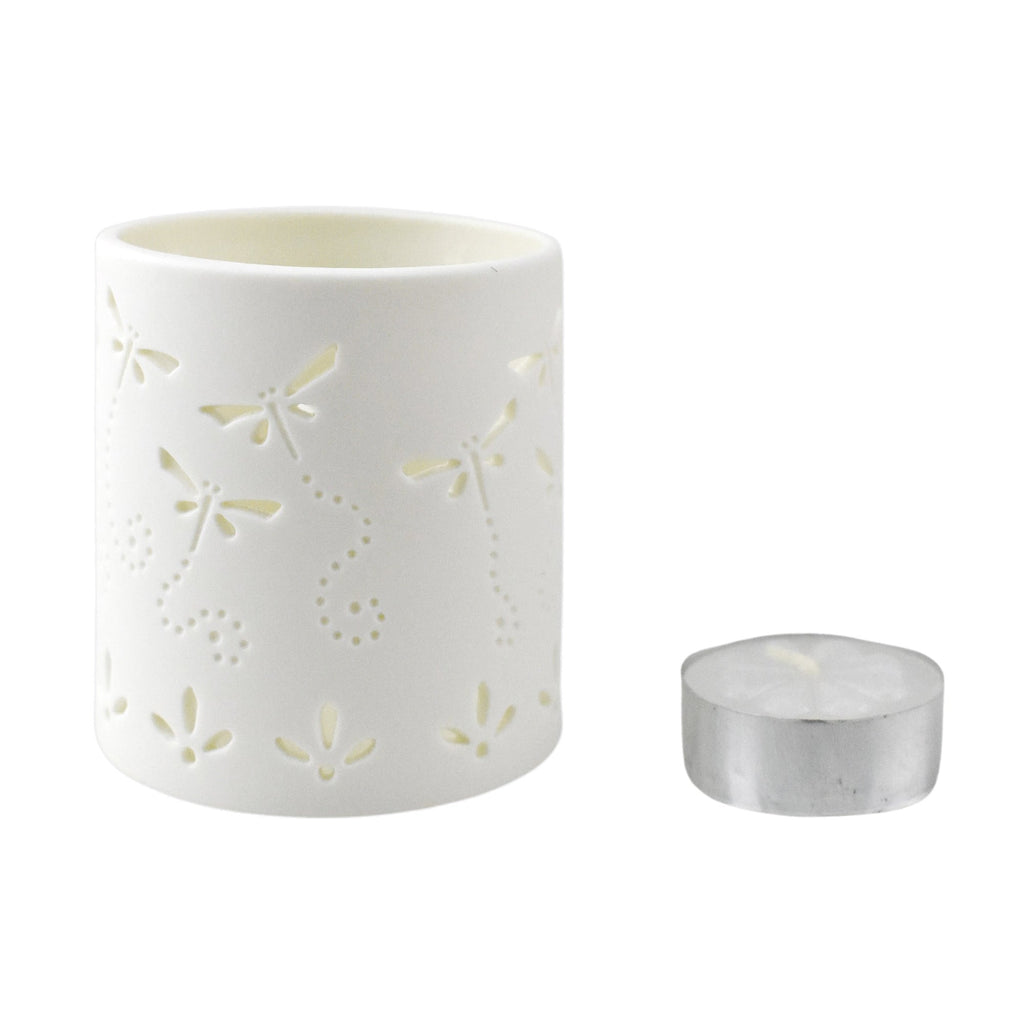 Dragonfly Ceramic Cylinder Tea Light Candle Holder, 2-3/4-inch, White