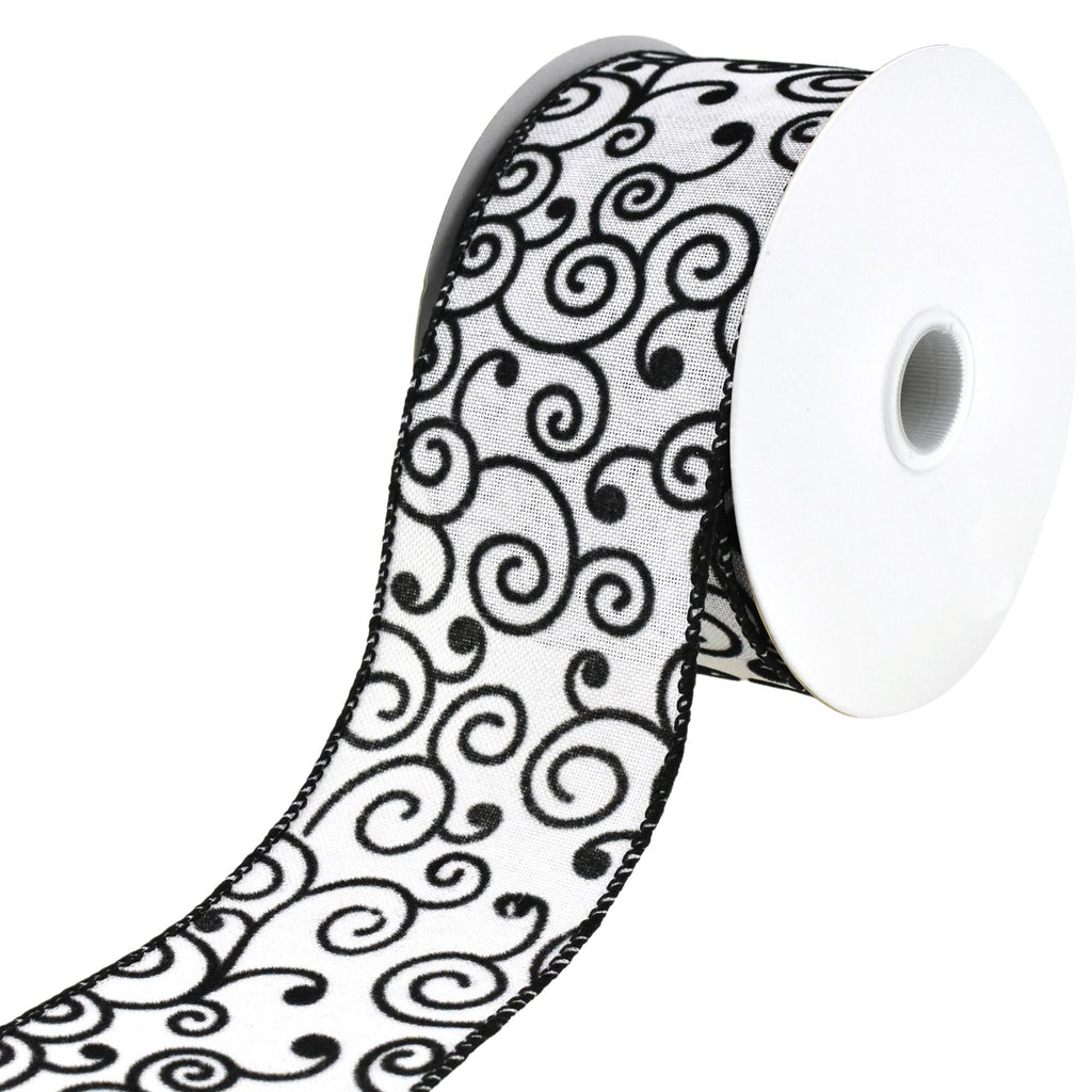 Flocked Swirl Filigree Wired Ribbon, 2-1/2-Inch, 10-Yard - Black/White