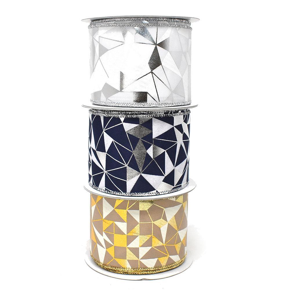 Metallic and White Abstract Wired Ribbon, 2-1/2-Inch, 10-Yard